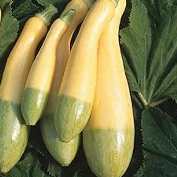 These distinctive slender fruits are predominantly yellow in colour with faint white stripes and light -green blossom ends. Best harvested when fruits are 10-15cm in length. Features a delicious nutty flavour and firm texture. Edible flowers.
